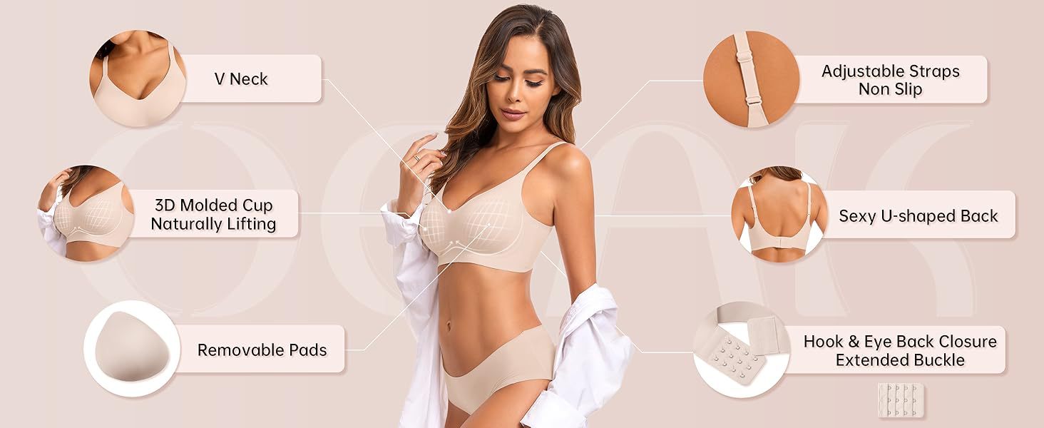 【Adjustable 4 row hooks V neck bralette】The V neck bralettes for women feature 4 rows of adjustable hooks, with 3 hooks on each row, providing additional support and concealing back fat. The V neck design of this bralette gives you a sexy cleavage look.